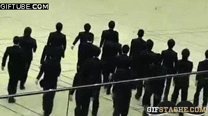 Why would anyone ever think the pants thing is a good idea? When would anyone ever have to jump into a pair of pants two guys are holding up for them?